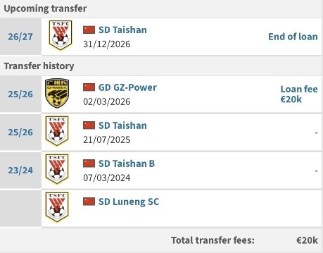 德转王昊斌个人页面显示,他于2月3日以2万欧元的租借费,从山东泰山租借加盟广州豹。租借合同为期一个赛季。